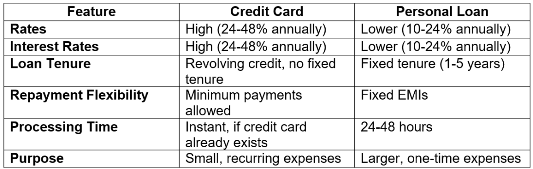 When faced with immediate financial needs, you may wonder whether to opt for a credit card or a personal loan. Here’s a quick comparison: