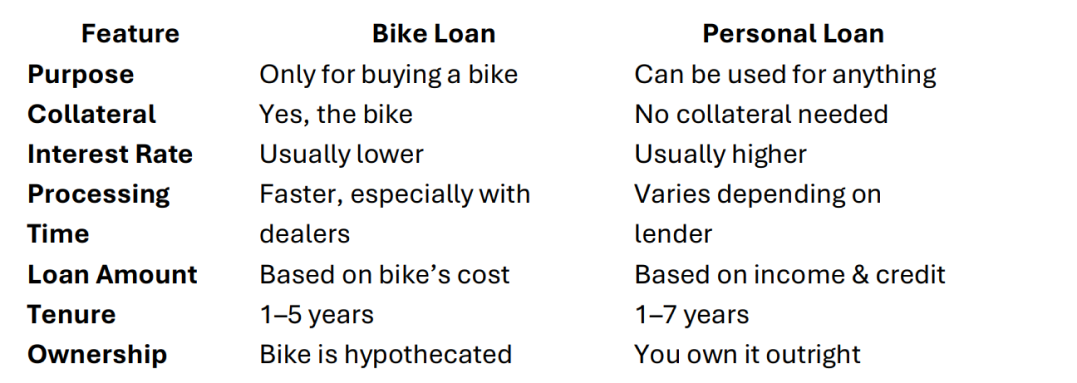 But if you want more flexibility — maybe you’re buying a used bike or need extra cash for insurance or accessories — a personal loan gives you that room to breathe.